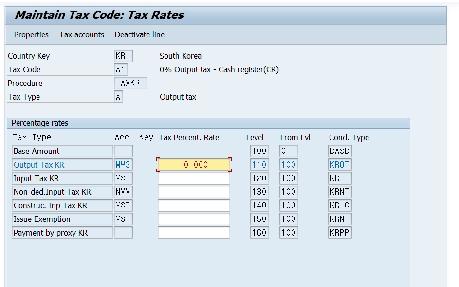 ※ 한번이라도 Tax Percent Rate 필드에 값을 넣은 경우에는 값을 지워도 자동으로 '0%'가 부여되게 됨. 빈간인 경우와 '0%'는 세금에 있어서는 완전히 다른 결과를 가져오게 되므로 빈칸인 경우에는 세금적용이 되지 않고 '0%'는 세금이 적용되지만 zero percent금액이 적용된다는 의미임. 그래서 필드의 값을 완전히 지우고자 할 경우에는 화면 상단에 'Deactivate Line'버튼을 클릭하여 해당되는 Tax Percent Rate 필드를 '0'이 아닌 '빈칸'으로 만들어야