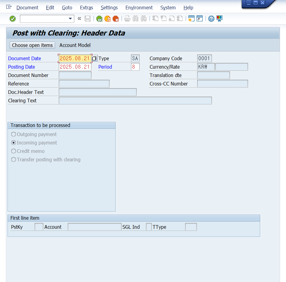 이러한 Open Item을 Clearing 하는 방법 에는 Post with Clearing 방법과 Account Clearing 두가지 방법이 있음