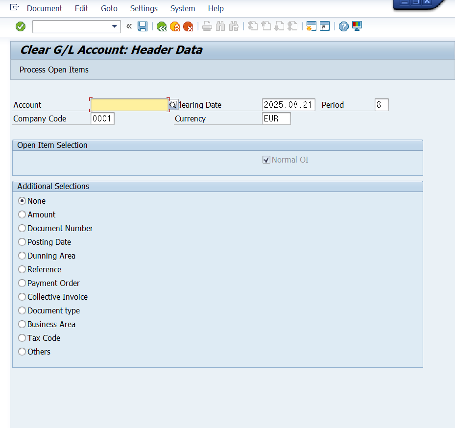 이러한 방법을 수행하면 전표 헤더 정보만을 가진 새로운 전표가 생성됨 ( 이 전표번호를 이용하여 추후에 clearing을 reset 하기 위한 용도로도 사용됨 , Document Splitting이 활성화 되어 있다면 전표의 라인아이템도 자동 발생함)