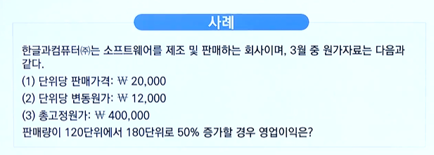 | 세전영업이익= 공헌이익률 X 매출액 - 고정원가 | |