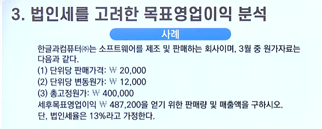 - 세후 영업이익 = (단위당 공헌이익 x 판매량 - 고정원가) x (1-법인세율) ★
