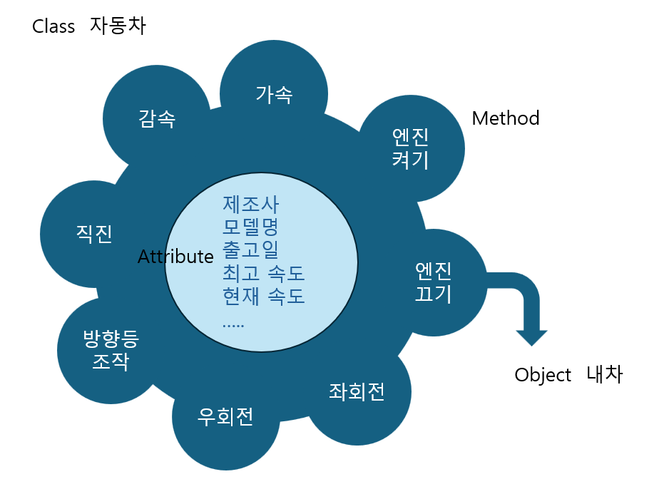 클래스는 속성과 메서드의 판을 모아놓은 것이고, 객체는 속성에 특정 값을 정해준 것임. 그 값들을 넣어주거나 변경하는 역할을 매서드가 함