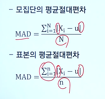 - 평균절대편차는 관찰값과 산술평균과의 차이들의 평균