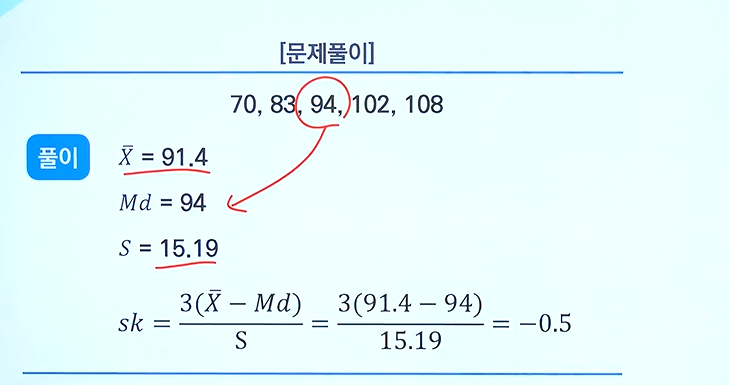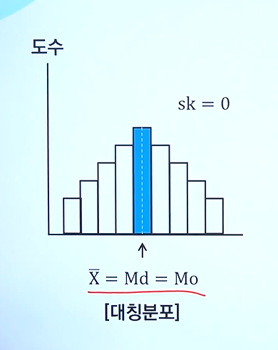sk=0 분포의 중심에서 평균=중앙치=최빈치이고, 자료의 분포는 좌우대칭