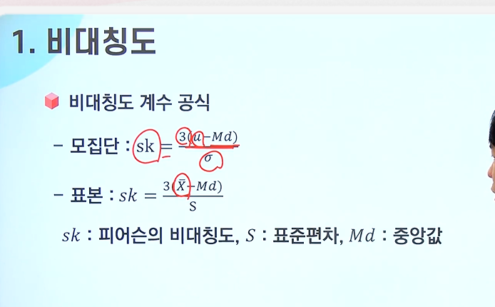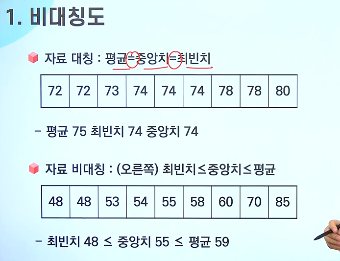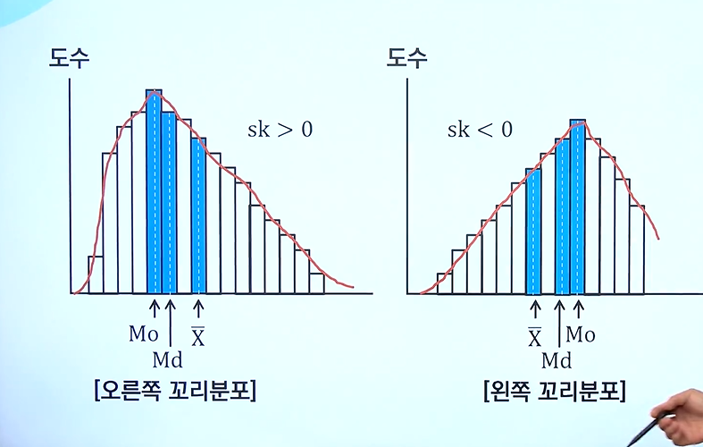 - 수집된 자료의 분포가 좌우대칭인가 또는 비대치이면 오른쪽 꼬리를 가진 분포인지, 왼쪽 꼬리를 가진 분포인지 알고 싶은 경우에 비대치도(왜도)를 측정해야함