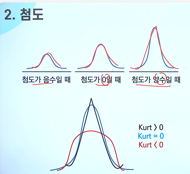 - 첨도는 자료분포의 뽀쪽함(peakness)정도를 측정함