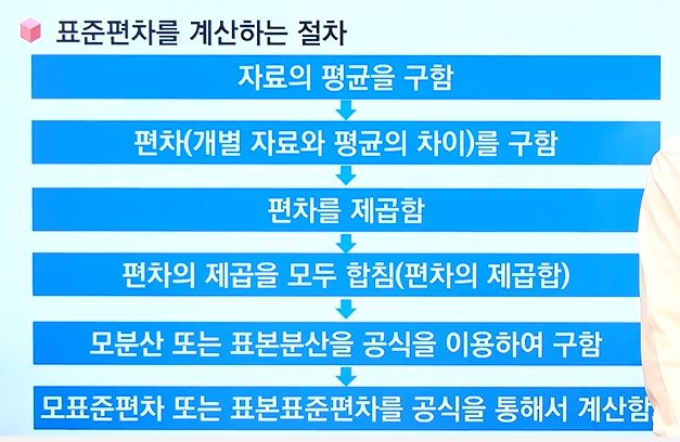 - 표준편차는 분산과 같이 자료들이 그의 평균으로부터 흩어진 정도를 측정함