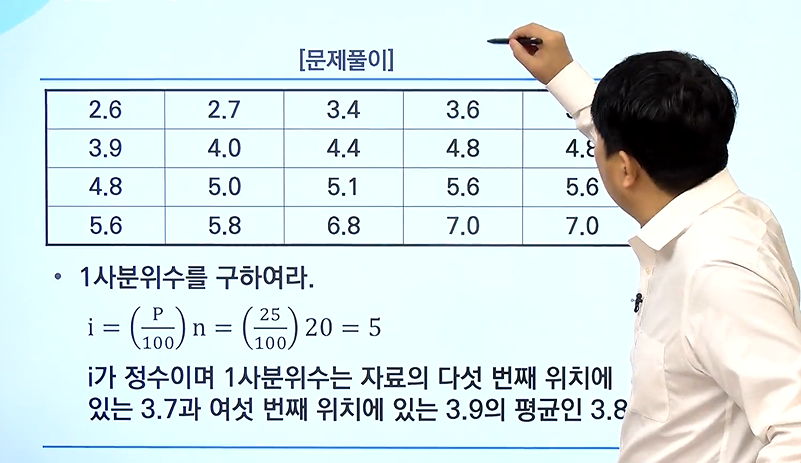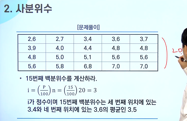 -만일 i가 정수이면 p번째 백분위수는 i와 (i+1)의 있는 자료를 평균한 것이