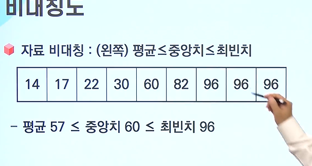 - 비대치도는 분포의 모양이 좌우대칭인지, 오른쪽 꼬리 분포인지, 왼쪽 꼬리분포인지 등과 같이 늘어진 꼬리의 방향을 나타냄