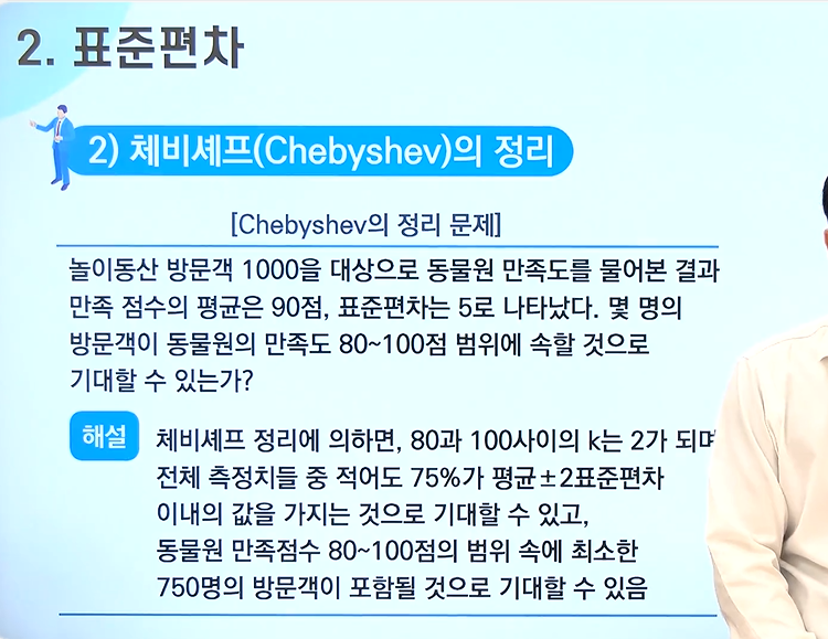 - 만일 자료의 분포가 정규분포가 아니거나 조사자가 모를 때에는 체비셰프의 정리를 적용할 수 있음