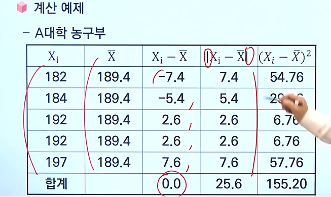 - 개별 자료와 평균의 차이인 편차를 모두 합하면 항상 0이 되기 떄문에 아무런 정보를 확인할수 없음