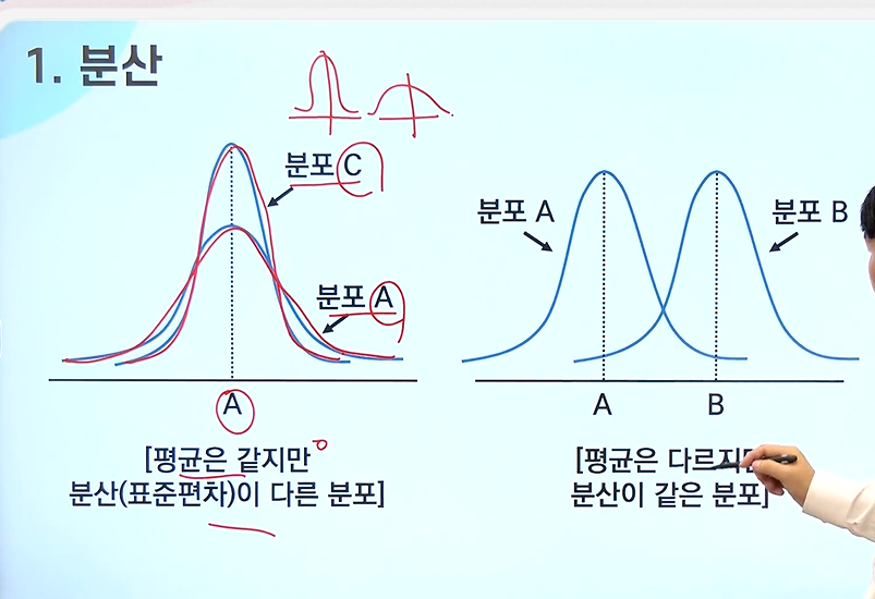 - 작은 값의 분산은 자료들이 평균 주이에 집중되어 있다는 것을 의미하고, 큰 값의 분산은 자료들이 평균을 중심으로 멀리 흩어져 있음을 의미함