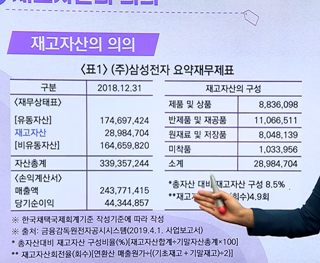 - 기업이 주된 영업활동과정에서 판매 목적으로 보유하거나 판매를 위해 생산 중인 자산 그리고 생산 또는 용역제공에 사용될 자산 (상품, 제품 재공품, 원재료, 소모품 등)
