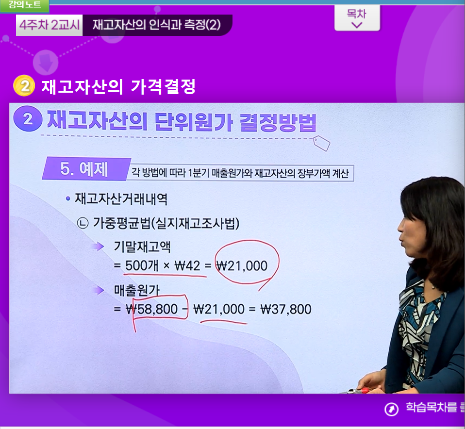 - 가중 평균법(실질재고조사법) : 한기간 => 판매가능원가/ 판매가능수량