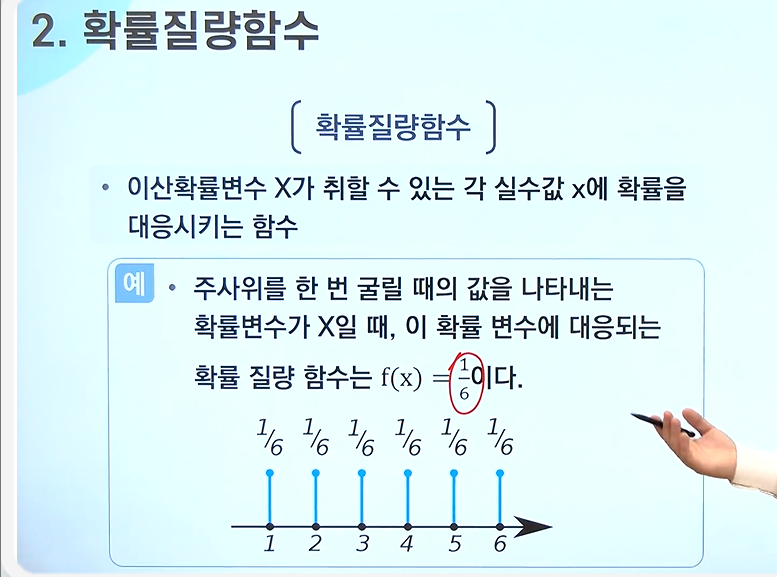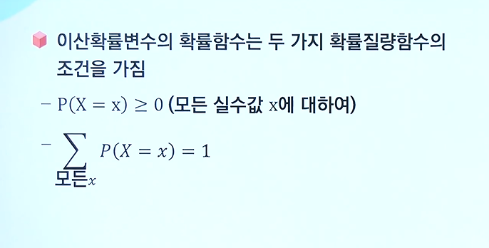 - 표본공간의 결과(확률변수가 취하는 값)가 셀 수 있는 정도로 한정되어 있고 확률변수가 취할 수 있는 모든 가능한 값이 정수와 같이 하나한 셀수 있고 나열할 수 있는변수