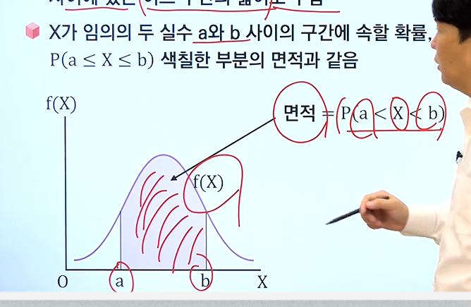 - 연속확률본포에서의 확률은 확률밀도함수 f(X)와 X축 사이에 있는 어느 구간의 넓이로 구함 (적분하여)