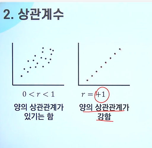 - 상관계수는 두 변수의 관계가 직선관계이고 완전한 비례관계이면 +1의 값을 갖게 되지만, 완전한반비례의 관계이면 -1의 값을 가지게 되므로 상관계수는 -1~+1 사이의 값을 갖게 됨