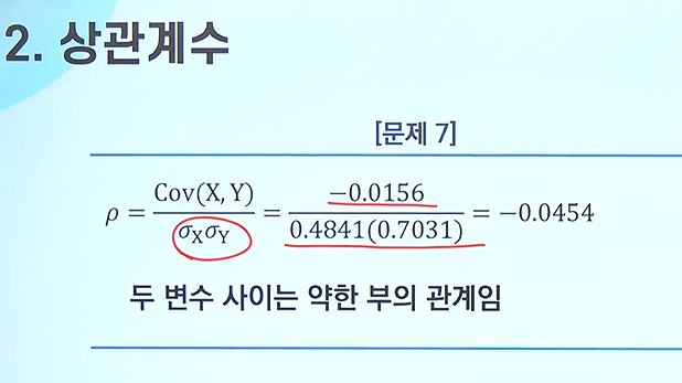 - 공분산은 두 변수의 선형관계를 밝혀주지만 그의 크기는 두 변수의 선형관계의 강도를 나타내는 지표는 아님