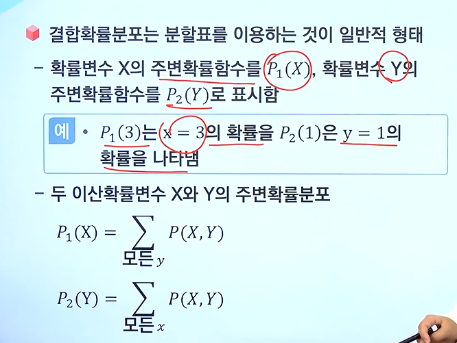 -두 확률변수의 개별확률분포가 표의 주변에 나타나므로 X와 Y의 개별확률분포를 주변확률분포라고 함