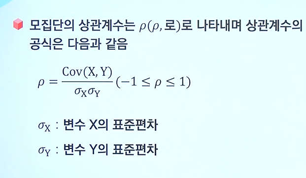 - 단위에 관계없이 두변수 X와 Y 사이의 밀접한강도를 측정하기 위해서는 X와 Y의 공분산을 X의 표준편차와 Y의 표준편차로 나누는데 이 값을 모집단 상관계수(Correlation Coefficient) 또는 X와 Y의 상관계수라고 함
