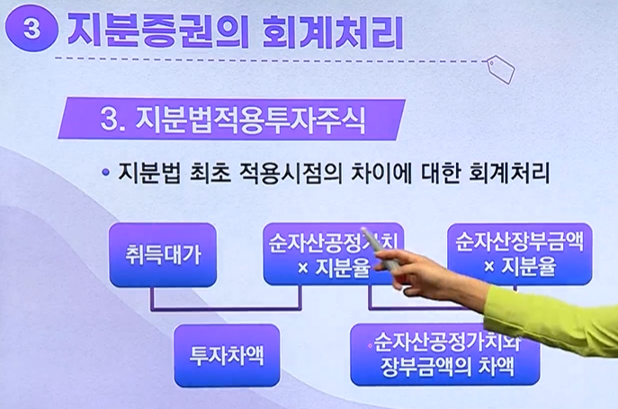 → 순자산 지분 금액 = 피투자기업(타겟기업)의 순자산장부금액 X 투자기업 지분율