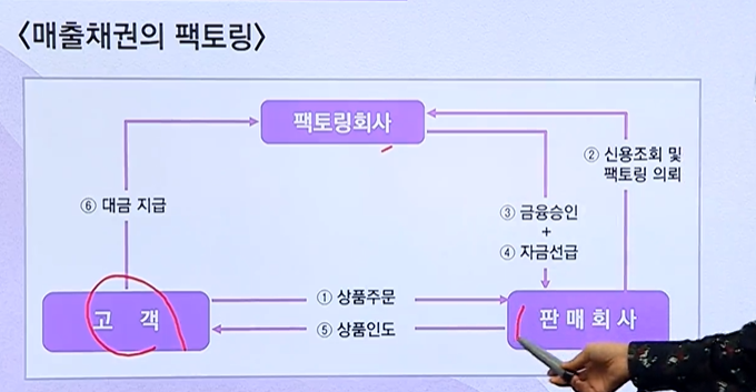 - 팩토링 회사 : 매출채권을 매입하여 이를 직접회수하는 사업모형