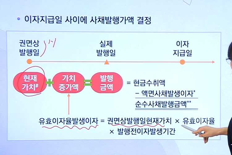 - 4월 1일 투자자로부터 3개월분 이자를 더 받고, 12월 31일에 12개월 이자를 지급하면, 발행자는 9개월분의 이자를 지급하는 것이므로, 수취한 경과이자를 미지급비용(미지급이자)로 인식