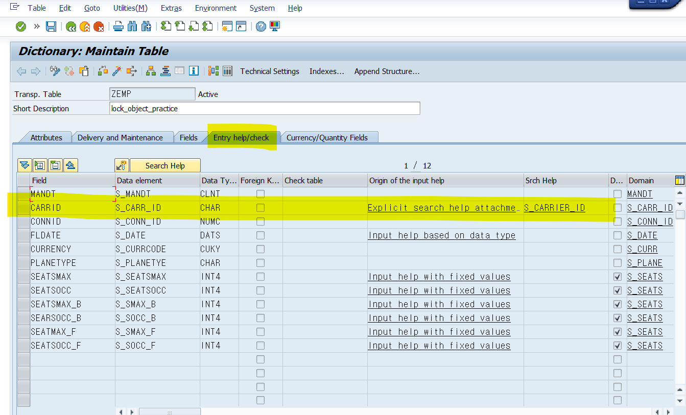 그리고 단순히 ZEMP 테이블에 존재하는 CARRID 필드의 데이터를 INPUT HELP로 구성하려면 Search help파라미터를 주석처리 하면 된다.