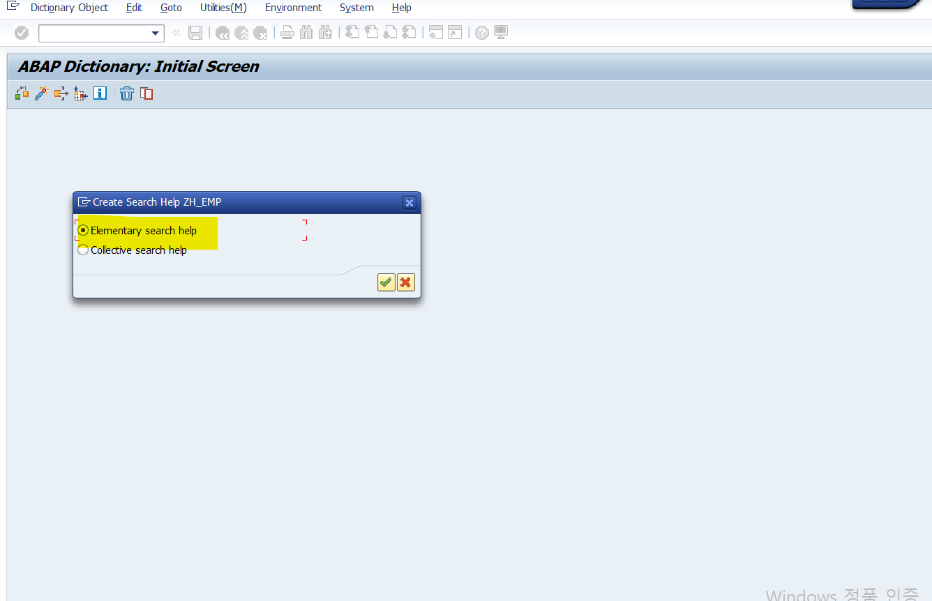위 예제에서는 아까 만들다 실패한(액티브가 안되는 데 교육용 서버이다보니 뭔가 생성을 막아둔게 아닌 지 의심 스러움) 'ZH_EMP' 서치 헬프를 사용한다.