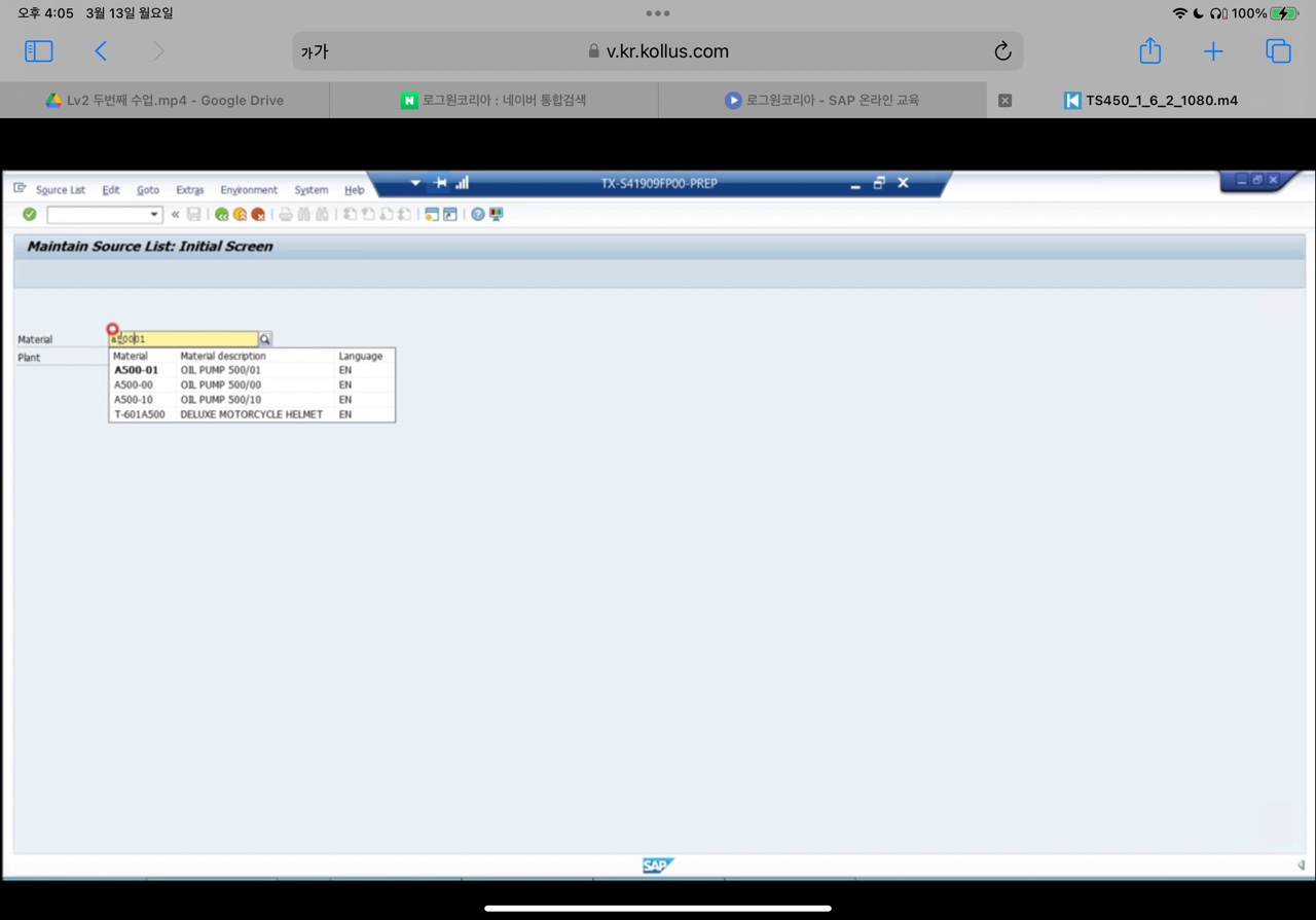 PR 생성 화면에서 Material, Plant 입력후 액티브 하면 source list화면이 보임