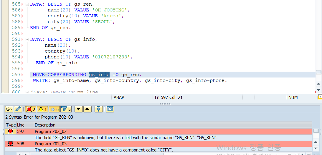 MOVE-CORRESPONDING 구문은 구조체에서 값을 할당 할때 많이 사용되며, 각 구조체의 같은 필드에 값이 복사 된다.