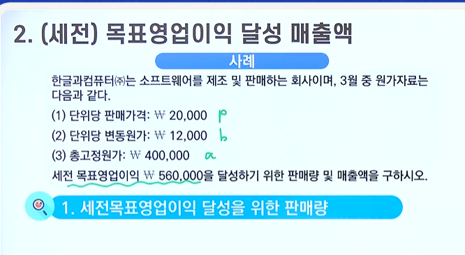 세전목표영업이익 = 단위당 공헌이익 x 판매량 - 고정원가 | |